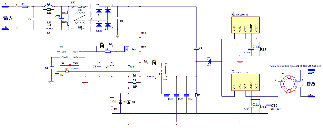 40W高PF無頻閃LED面板燈應(yīng)用方案(輸出56V@700mA):ZA8606+ZA8518A-T5 典型應(yīng)用電路