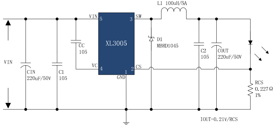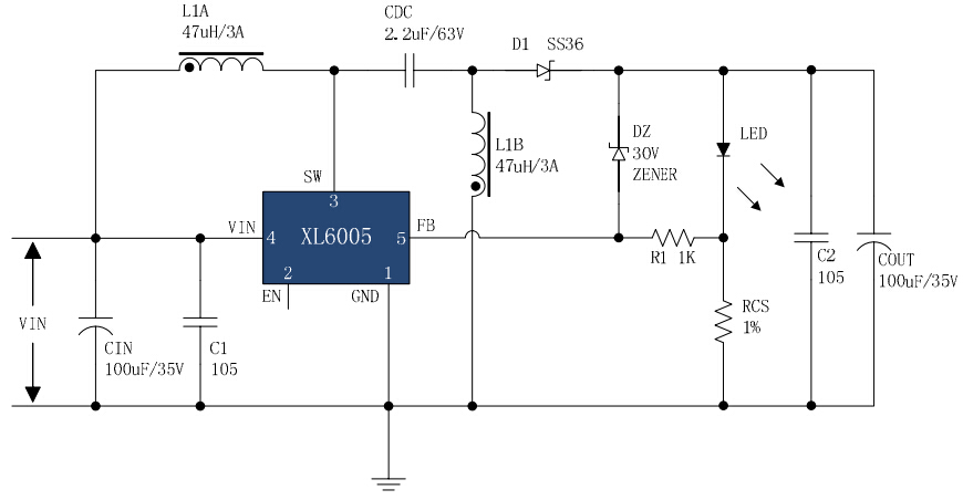 (1) XL6005E1采用自主開發的BCD工藝,轉換效率高,內部集成功率MOSFET ,外圍器件少,系統成本低;