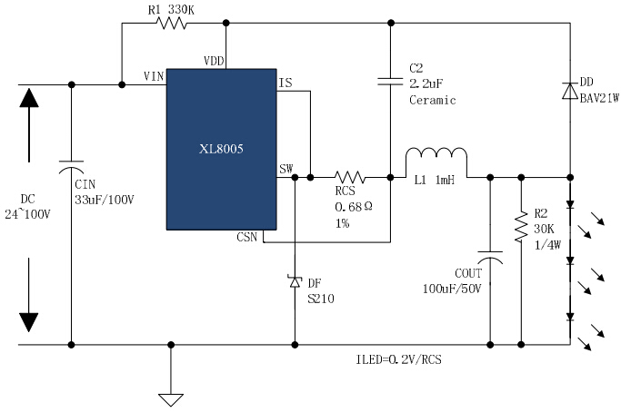 (2) XL8005E1內部集成高壓功率MOSFET ,外圍器件少,系統成本低;
