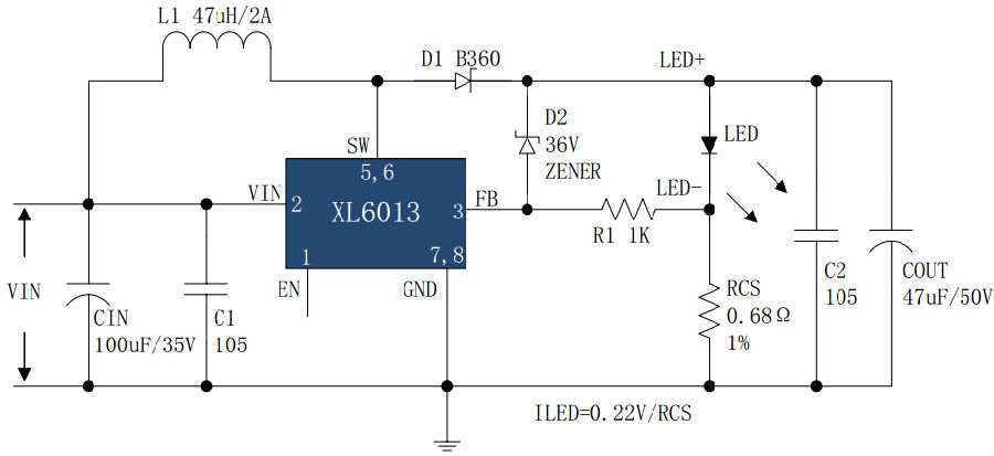 (3) XL6013E1內置過溫保護、過流保護、LED 開路保護全套可靠性保護電路,可靠性高;