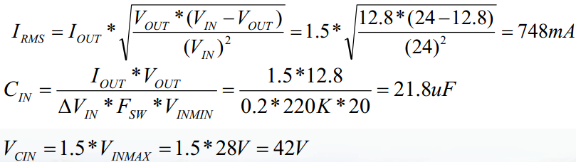 CIN選擇容量大于22uF,IRMS電流大于750mA,VCIN耐壓大于42V的電容。