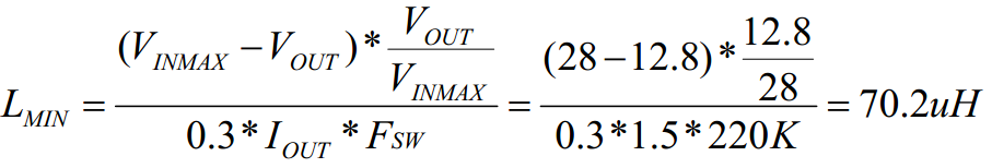 ⒈ 電感的選擇取決于VINMAX與VOUT壓差、所需輸出電流與芯片開關(guān)頻率,電感最小值計(jì)算公式如下: