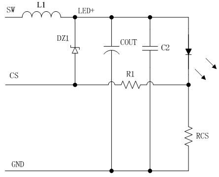 增加開路保護(hù)電路(見下圖),其中R1=1K,DZ1=1.2*VOUT。增加開路保護(hù)后,開路電壓約等于DZ1的值,從而可以保護(hù)LED及采樣電阻RCS。