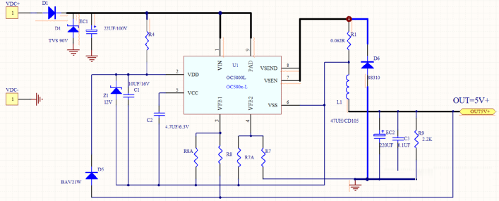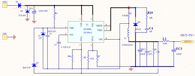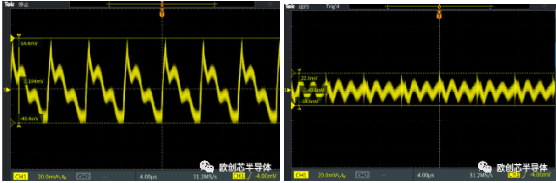 【引言】由于電路中存在電感,MOS,二極管等開關(guān)器件,同時(shí)PCB上的走線存在寄生電感,寄生電容等參數(shù),在開關(guān)器件工作的同時(shí),會(huì)在地平面或者輸出的正端平面上產(chǎn)生一定的波動(dòng),這個(gè)就是我們常說的輸出紋波電壓。通常輸出的紋波頻率是和開關(guān)器件的頻率保持一致,同時(shí)紋波電壓是交流信號,輸出紋波太大有很大的弊端,會(huì)導(dǎo)致器件壽命縮短或者導(dǎo)致器件損壞,所以在電源設(shè)計(jì)之初就要限定輸出紋波電壓在一定的范圍內(nèi)。如下是我們OC5800L案例分析減小紋波電壓的辦法。