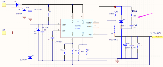 肖特基二極管D6陽極要靠近輸入電容的負(fù)極,同時(shí)D6的陰極要靠近芯片的7.8腳,并且盡可能不要走過孔。