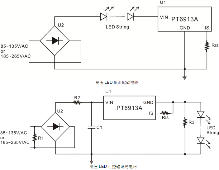 PT6913是一款特殊的線性恒流驅動 IC,適用于驅動高電壓小電流 LED負載。其應用方案外部元件極少,體積緊湊,能簡單靈活地設計應用于各種 LED產品。簡單的線性驅動方式不僅可改善功率因數,提高效率,還可避免 EMI干擾問題。